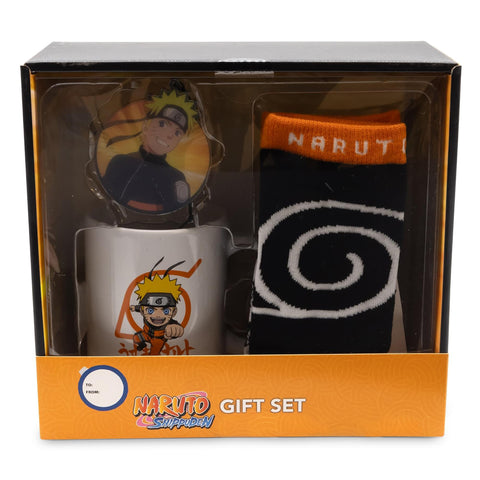 Write me a description for a Naruto Shippuden Gift Set. The Gift Set features a 12 Oz. Mug, Crew Socks, and a Christmas Ornament. The mug has a detailed Naruto Uzumaki chibi character design, while the socks have Naruto's Hidden Leaf Village logo pattern. The Christmas Ornament has a classic Naruto character design. This is great for all fans of the Manga and Anime. The socks are made of a soft and stretchy 98% polyester and 2% Spandex.