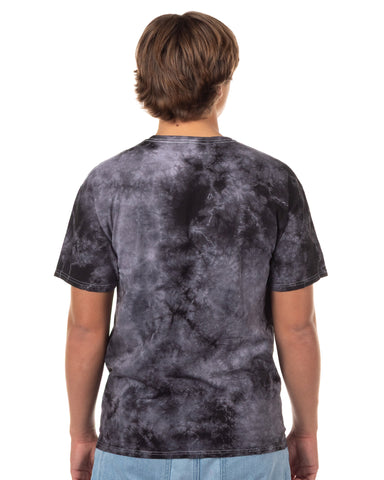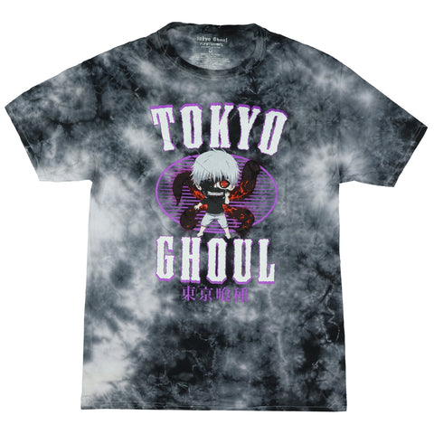This men's short-sleeved shirt features Ken Kaneki in a chibi-style design with his Rinkaku Kagune extending behind him. A purple striped oval adds contrast behind the character, with the word "Tokyo" above and "Ghoul" below the print. The soft tie-dye fabric makes each piece unique while offering a casual look. It is made from 100% cotton and includes a classic crew neckline and a relaxed fit. Tokyo Ghoul is a dark fantasy series known for its intense storytelling and layered characters, especially Kaneki's transformation from human to half-ghoul. This tee reflects that shift with a lighter artistic style, combining fandom with an everyday wearable design.
