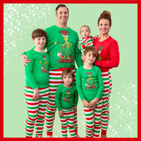 These are 100% Dr. Suess Grinch pajama sets, guaranteed!! Dr. Suess' GRINCH Who Stole Christmas is an all-time great holiday Christmas story that men, women, boys, and girls all know and love! Each pajama set features classic designs inspired by the magical books and animated cartoon films we all know and love! The men's and boys 2 piece set features a green long sleeve shirt with character design and pants with a red, white and green striped pattern. The women's and girls feature the same style pants with a red long sleeve shirt with Christmas ornament designs of characters from Whoville and GRINCH himself as well. The baby size is a one-piece union suit design of a red, white and green striped pattern and an Embroidered character design. All the outfits are made of a snug-fit 100% cotton fabric.
