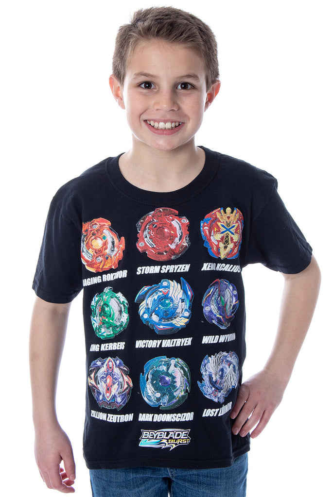 Your child will love this graphic print t-shirt featuring the spinning tops from the beloved Beyblade Burst series! Featuring favortie Beyblade Burst spinner tops: Raging Roktavar, Storm Spryzen, Xeno Xcalius, King Kerbeus, Victory Valtryek, Wild Wyvron, Zillion Zeutron, Dark Doomscizor, and Lost Luinor; this t-shirt is sure to feature your child's favorite spinner top! Great for everyday wear, your child will want to wear this t-shirt every day, whether lounging around the house or playing a round of Beyblade! Made of soft and durable cotton, this shirt will hold up no matter what! The breathable fabric and short sleeves make this shirt great for any season of the year! To help maintain the vibrant color of the graphic print and the softness of the cotton fabric, please machine wash this shirt inside-out with like colors using a mild detergent and tumble dry on low. Do not use bleach!