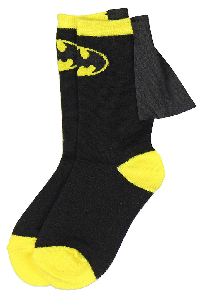 GREAT DC Comics superhero boys caped crew socks. These youth sized socks feature Batman, Superman, and The Flash logo details with attached capes. Size 4-6 fits children 3-5 years old. Size 7-9 fits children 5-7 years old. Your child will feel like a superhero in these comfortable caped crew socks. The socks and heels of these socks are reinforced to help with comfort and durability.