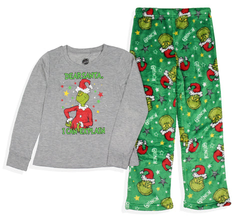 Immerse yourself in the whimsical world of Dr. Seuss with these Pajamas. This delightful lounge set is the great choice for young fans of the beloved author and his timeless stories. This sleep set features a fun and playful design on the grey top with the text " Dear Santa, I Can Explain." and contrasting green plush pants that have a charming Grinch allover holiday design. Made with soft, comfortable fabric, these pajamas are designed for a cozy and peaceful night's sleep. The breathable material ensures that your child will sleep soundly, making these PJs a must-have for bedtime. They're great for lounging around on a lazy weekend morning or for holiday gatherings with family and friends. Your child will love wearing them all year round, creating cherished memories and instilling a love for reading and imagination.