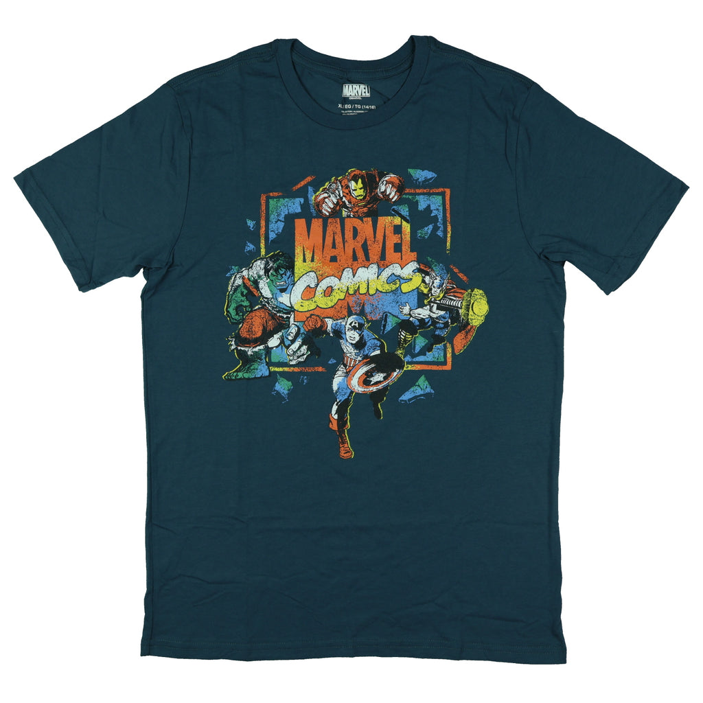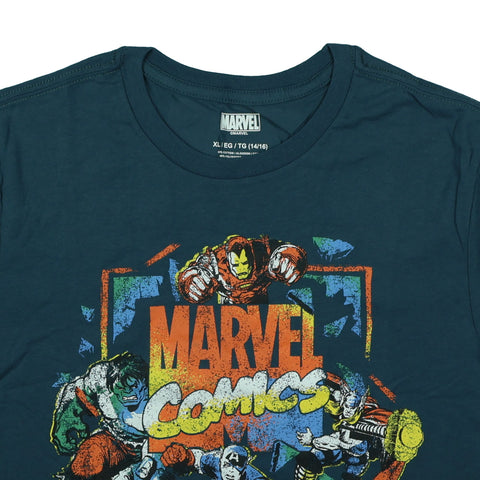 This boy's Marvel Comics tee combines standout graphics with everyday comfort. The front showcases Iron Man flying above the "Marvel Comics" logo, Thor lifting the lettering as if ready to throw it, Captain America running forward with a shield, and Hulk peeking from the side. On the back, the shirt features "The Avengers" text along with the team's names, finished with the phrase "Earth's Mightiest Heroes." Made with a 60% cotton and 40% polyester blend, it offers softness, durability, and a comfortable printed tag. Marvel Comics has introduced generations to superheroes that embody strength, teamwork, and resilience. With detailed artwork of fan-favorite characters, this boys' graphic tee captures that spirit in a wearable design.