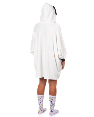 Enjoy your downtime in this Peanuts Snoopy dorm sleep shirt set, thoughtfully designed for women seeking comfort and playful style. The soft, oversized hoodie features an embroidered Snoopy design with 3D floppy ears and a functional kangaroo pocket, paired with coordinating non-slip mid-calf socks. Its roomy fit lets you relax completely while maintaining a fun, casual look.