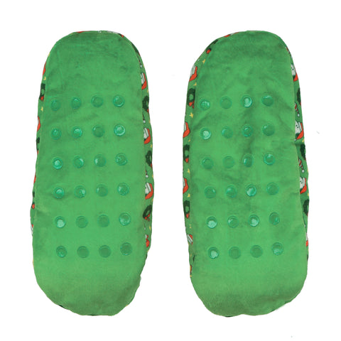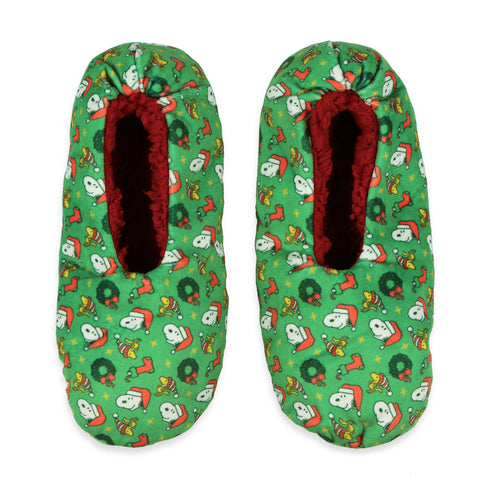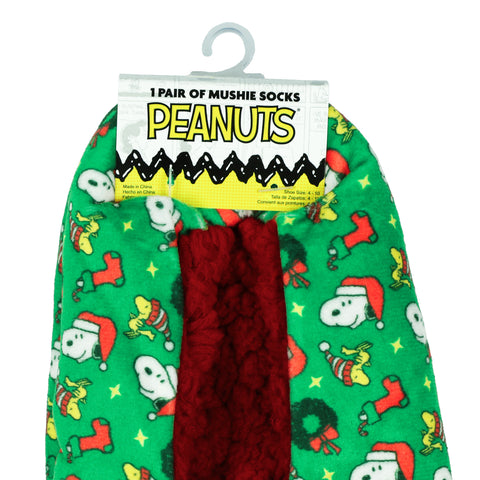 Experience cozy comfort with Mushies Snoopy and Woodstock slipper socks. Featuring an all-over holiday-inspired design with stockings, wreaths, and stars, these slipper socks combine a smooth velvety surface with plush fleece inside for warmth and softness. The gathered elastic at the heel keeps them secure while the non-slip sole adds stability on smooth floors, making them functional and comfortable.