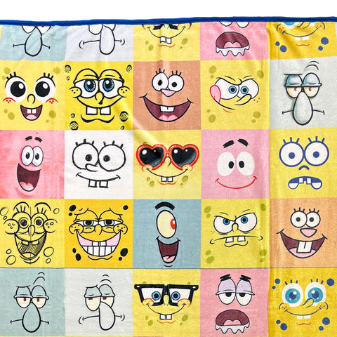 This SpongeBob SquarePants fleece throw blanket features a patchwork of expressive faces of SpongeBob, Patrick, Sandy, Squidward, Plankton, and Mr. Krabs. With styles ranging from sketch illustrations to adorable, baby-faced versions, and some wearing sunglasses, the design captures the playful spirit of each character. The blanket measures 45 by 60 inches, offering lightweight warmth and an eye-catching design whether used on a bed, a couch, or during relaxation. As one of the most recognizable animated series in TV history, SpongeBob SquarePants continues to connect with fans through its colorful cast and quirky humor. This throw provides longtime fans and new viewers a way to bring a little of Bikini Bottom into their everyday spaces.
