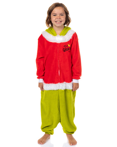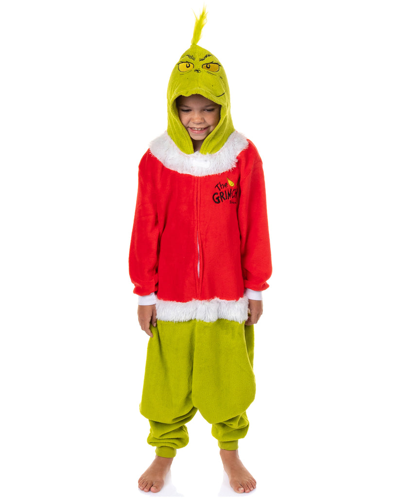 Bring a touch of Whoville into your child's wardrobe with this Grinch union suit. Designed to look like The Grinch dressed in his Santa Claus disguise, it features bold embroidered details on the hood, a tuft of soft green hair, and a full-body design that captures the holiday mischief of Dr. Seuss's character. The cozy one-piece style provides warmth and coverage, while the snap button cover keeps the zipper neatly concealed. The Grinch remains one of the most memorable figures in children's storytelling, and this pajama brings that playful energy to life. Its mix of soft fabric, character details, and thoughtful construction offers both practicality and fun. Kids can lounge, play, or drift off to sleep in a design that feels as comfortable as it is recognizable.