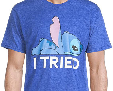 Who wouldn't want a cute yet vicious alien for a pet? Wait, did I mention he's an intergalactic criminal. Disney's Lilo and Stitch movie is a classic, featuring an island girl and her awesome pal! This t-shirt features a Stitch/Experiment 626 laying down on the floor with text that reads "I Tried," Perfect for fans who love experiment 626!