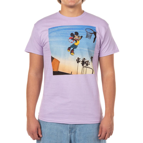 This Disney tee brings Mickey Mouse to life with a fun twist — he’s flying through the air for a slam dunk against a sunset sky with palm trees in the background. The bold artwork pops against the light purple color, giving it a cool, laid-back vibe that’s easy to wear any day of the week.