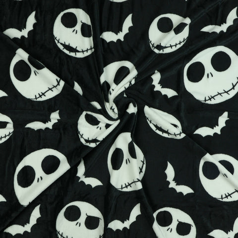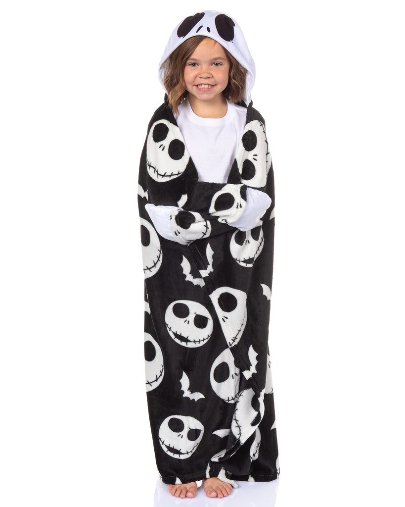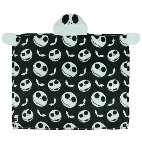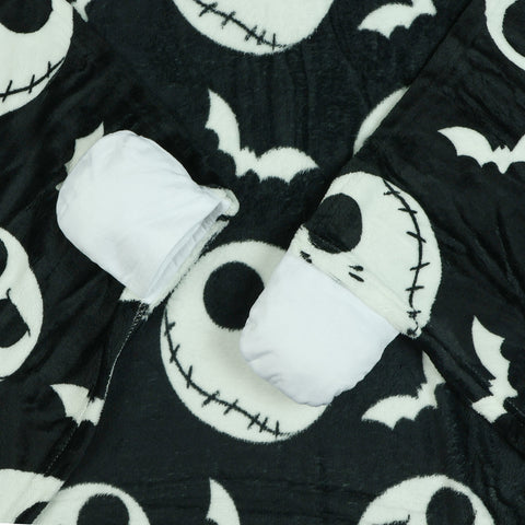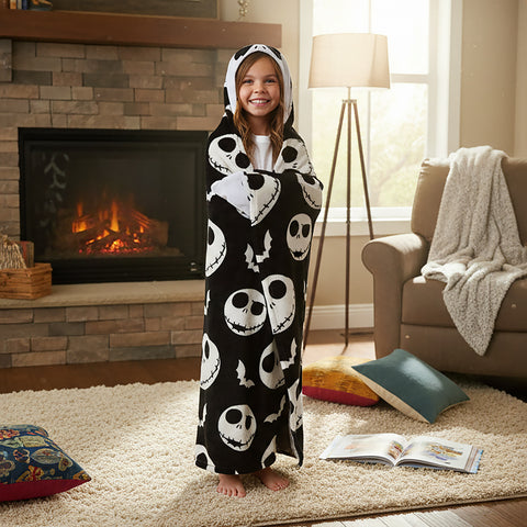 Bring comfort and character together with this Nightmare Before Christmas Jack Skellington Hooded Blanket. The soft fleece fabric features an all-over print of Jack's head and white bats on a black background, paired with a hood that displays Jack's face for a playful look. Measuring 40 by 50 inches, this wearable throw is designed for warmth and mobility, with hand pockets that allow you to stay wrapped up while keeping your hands free. The Nightmare Before Christmas continues to captivate fans with its imaginative world and unique characters. This hooded blanket celebrates that timeless style through cozy functionality and detailed design. Whether lounging or layering, it offers soft warmth while showcasing your favorite character in a bold, comfortable way.