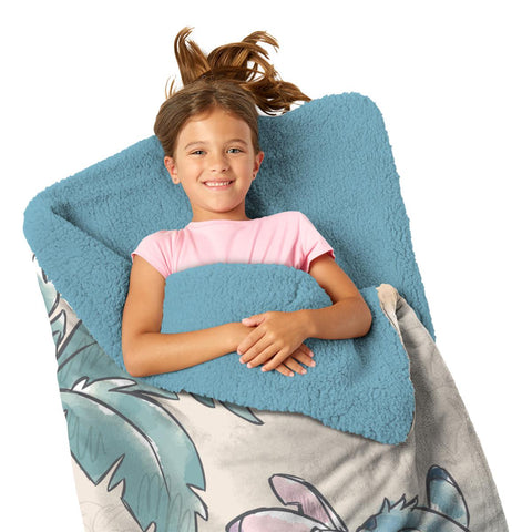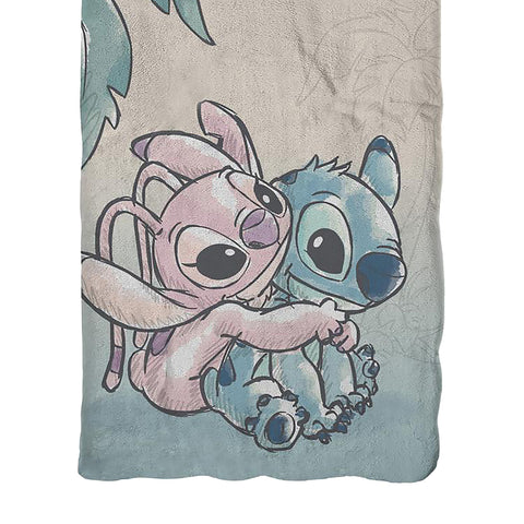 The Disney Stitch and Angel "Ohana Means Family" Slumber Bag Zip-Up Blanket brings warmth and friendship to your rest time. Angel hugs Stitch from behind as he sits under a palm tree, with a soft, beach-inspired backdrop of a blue sky and tan sand. The detailed artwork and reversible construction make it a cozy and visually appealing addition to any living space or bedroom. This versatile piece functions as both a blanket and a sleeping bag, measuring 56" x 27" when zipped and 56" x 54" when open. Made from 100% polyester with a thick fleece lining, it provides comfort and durability that lasts.