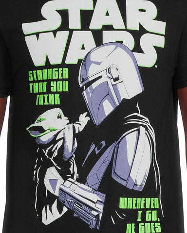 This men’s short-sleeve shirt features a moment of connection between the Mandalorian and Grogu, brought to life in bold contrast and neon tones. Positioned across the chest, the print shows the Mandalorian holding Grogu up close, with the words “Stronger Than You Think” and “Wherever I Go, He Goes” in bright green. A white “Star Wars” header outlines the connection to the larger galaxy while the black base gives the colors room to stand out. The Mandalorian series follows a lone bounty hunter and his evolving bond with Grogu, a Force-sensitive being with mysterious origins. This shirt draws on that narrative with a graphic that reflects loyalty, strength, and trust—all captured in a clean, casual format built for regular wear.