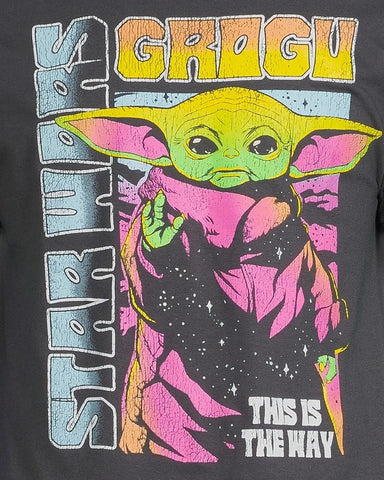 This men's short-sleeved tee features Grogu from The Mandalorian, captured in a dynamic pose as he channels the Force. Bright sunset-inspired tones highlight the design, with the name “Grogu” placed above the image, “Star Wars” printed vertically along the side, and the phrase “This Is The Way” in the bottom left corner. All elements appear on a charcoal gray base that complements the vibrant colors. The Mandalorian series introduced Grogu as a mysterious and powerful character, instantly becoming a fan favorite. This t-shirt brings that character to life through a comfortable, easy-to-wear graphic layout that is great for casual style.