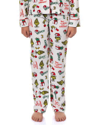 Wrap your little one in holiday cheer with this Grinch-themed pajama set! From top to bottom, this set is covered in playful Grinch designs—sneaky eyes, stacked gifts, and the words "How The Grinch Stole Christmas” pop against a bright white background. The long-sleeve button-up top features a cute notch collar and red piping for a touch of style, while the matching elastic-waist pants provide comfortable, easy movement. These PJs are made for lounging, relaxing, or just feeling festive at home. Made from super soft velveteen 100% Polyester, this set feels like a warm hug. Stretchy, breathable, and oh-so-comfy, these pajamas keep your little one cozy whether they're snoozing or curling up with a holiday movie. And when it’s time to wash? Just turn them inside out, toss them in cold on the gentle cycle, and tumble dry low—it’s that easy to keep these festive PJs looking fresh and fun.