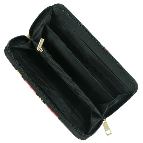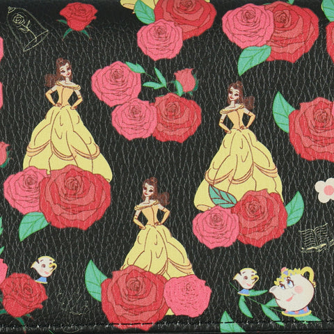 This Beauty and the Beast zip-around wallet combines style and everyday practicality. The outside features Belle, Chip, and Mrs. Potts surrounded by red roses on a bold black background, creating a design that stands out while remaining functional for daily use.