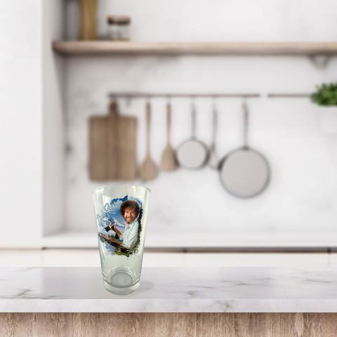 This 16-oz pint glass highlights Bob Ross and one of his classic winter landscapes, with snowy mountains, evergreen trees, a winding river, and a calm blue sky. Each side of the glass captures the scene along with Bob Ross, smiling with a paintbrush in hand. Built from sturdy glass, this pint is usable and display-worthy, making it a balanced option for drinkware or collection shelves. Bob Ross became widely known for his painting tutorials emphasizing creativity, relaxation, and joy in art. This glass celebrates that spirit by blending everyday functionality with detailed artwork that reflects his memorable style. Hand wash only and not microwave safe, this pint is designed for ages 14 and up and adds a thoughtful touch to any glassware set.