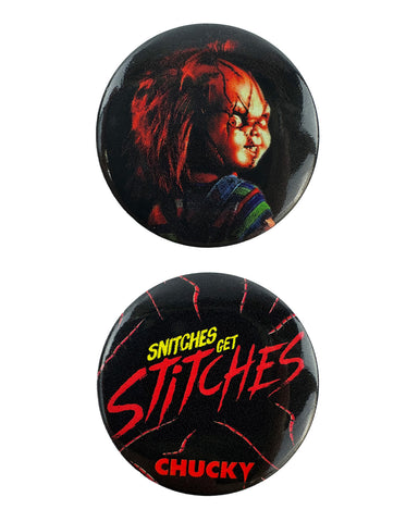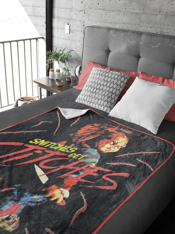 Stay cozy while showing off your dark sense of humor with this Child’s Play “Snitches Get Stitches” Throw Blanket! Featuring the iconic Chucky and his menacing grin alongside the phrase “Snitches Get Stitches,” this blanket brings a bold horror vibe that fans of the classic film will instantly recognize. Made from 100% polyester fleece, it delivers a super soft, plush feel that’s perfect for lounging on the couch, relaxing in bed, or curling up during a scary movie marathon. The blanket also includes matching themed buttons for an added collectible touch. Measuring 45 inches by 60 inches, it’s the ideal size for fans of all ages who love comfort with a creepy twist.