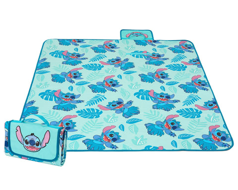 This outdoor blanket showcases Stitch in multiple hula dance poses, wearing a grass skirt and matching headpiece among tropical leaves. The all-over print is brought to life with shades of blue and green, accented by a dark blue border that frames the artwork. Lightweight yet functional, the throw folds easily into its attached carrying case with a secure closure and handle, making it convenient for outings and travel. Disney's Lilo & Stitch has become a lasting favorite, with Stitch celebrated for his playful and mischievous personality. This throw combines that fan-favorite character with practical everyday use, offering a comfortable polyester fabric that is durable and easy to maintain. Its design balances decorative appeal with portability, making it a versatile option for indoor comfort or outdoor activities.