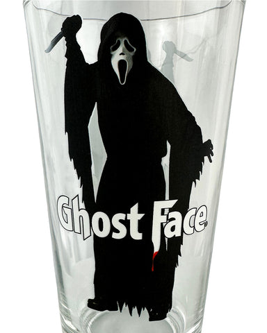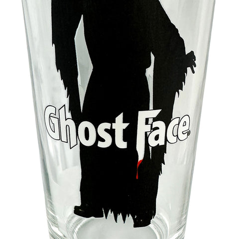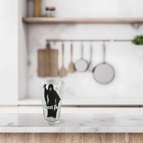 This 16-oz pint glass features Ghost Face in a menacing stance, holding his weapon high with detailed artwork displayed on both sides. Across the graphic, the word "Ghost Face" is printed in bold lettering with blood dripping from the "F," giving the design extra depth. Made from sturdy glass, the tumbler offers durability while showcasing a vivid print that stands out in any barware set. This drinking glass functionally captures that imagery, combining collectible appeal with everyday utility. It is a versatile addition to drinkware collections and themed setups. It is built for hand washing only and intended for ages 14 and up.