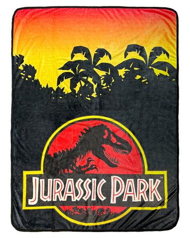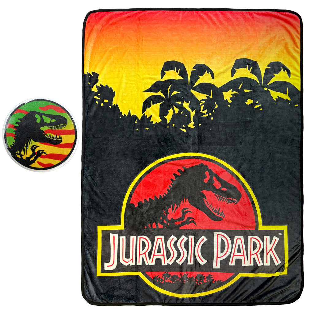 Wrap yourself in the world of dinosaurs with this Jurassic Park fleece throw and matching button set. The throw features the unmistakable T. Rex logo in front of a sunset backdrop with palm trees, framed by a sleek black border. Measuring 45" x 60", it's crafted from soft polyester fleece for warmth and comfort in a lightweight design. The coordinating button mirrors the prehistoric theme with green and yellow tones, red claw marks, and a T. Rex graphic, making it a collectible keepsake. Jurassic Park has thrilled audiences for decades, bringing prehistoric creatures to life with groundbreaking visuals and storytelling. This blanket set captures that excitement in a functional, everyday piece.