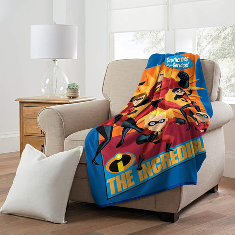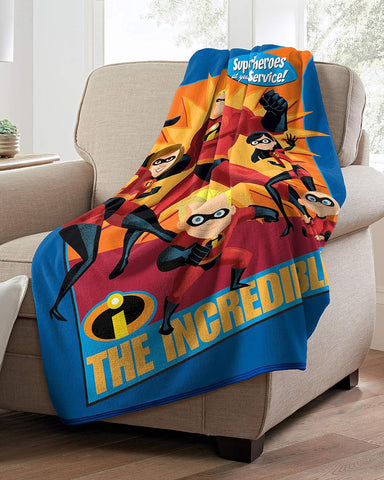 Relax and get ready for adventure with this Incredibles fleece throw blanket! Featuring a bold graphic of the Parr family, including Mr. Incredible, Elastigirl, Violet, Dash, and Jack-Jack. This fun and colorful blanket is sure to be a hit with fans. The cozy micro raschel throw blanket measures 46" x 60" and is great for snuggling up on the couch for a movie night, adding an extra layer to your bed, or simply enhancing your superhero-themed decor. Made from soft polyester fabric, this throw is easy to care for. Just machine wash in cold water with like colors and tumble dry on low.