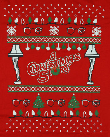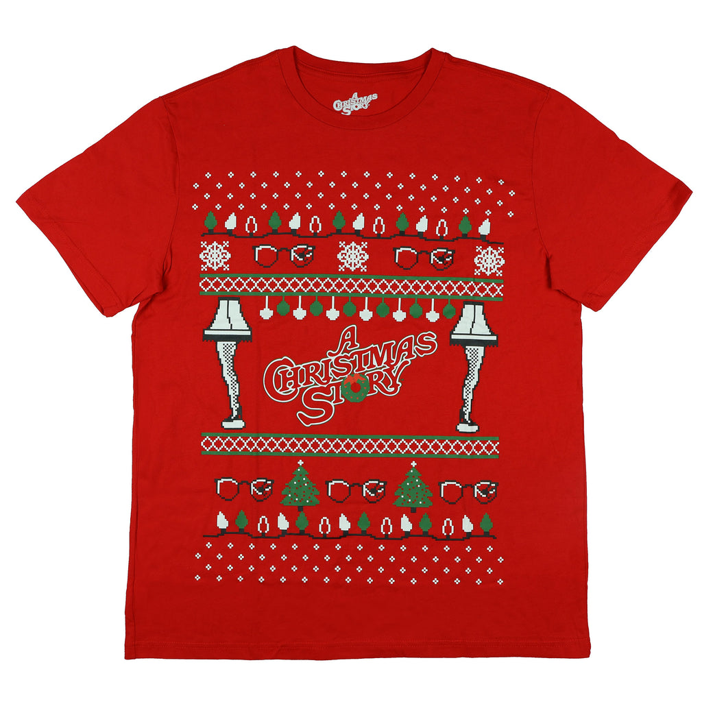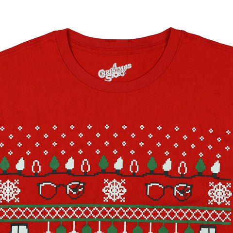 This men's short-sleeve shirt is designed with a bold, ugly sweater-style pattern inspired by A Christmas Story. The print includes fan-favorite icons such as the leg lamp, broken glasses, snowflakes, and Christmas lights, all surrounding the movie title at the center. The red background enhances the sweater-inspired design, making it stand out while offering the comfort of a soft cotton-poly blend. A Christmas Story remains one of the most recognizable holiday comedies, with imagery that continues to connect with fans. This tee combines familiar visuals with practical comfort, making it suitable for lounging with pajama pants or everyday casual wear.