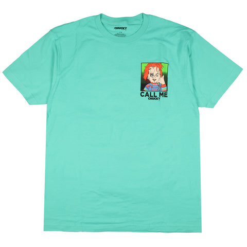 Let's face it, he's your friend 'til the end. Show off your love for Chucky with this tee shirt inspired by the horror movie franchise "Child's Play". This men's t-shirt features a front and back graphic design featuring the terrifying Chucky posed with his hand in a telephone gesture and the text " Call Me Chucky". A small graphic is featured at the top left of the front of the shirt, while a larger similar graphic can be found on the back of the tshirt. This casual tee pairs great with a pair of your favorite jeans or wear with your favorite pajama pants. This fun t-shirt makes a great gift for 80s and 90s slasher movie lovers and fans of the "Child's Play" series.