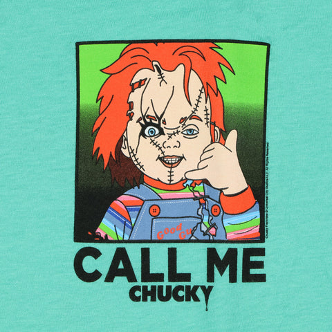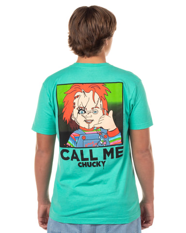Let's face it, he's your friend 'til the end. Show off your love for Chucky with this tee shirt inspired by the horror movie franchise "Child's Play". This men's t-shirt features a front and back graphic design featuring the terrifying Chucky posed with his hand in a telephone gesture and the text " Call Me Chucky". A small graphic is featured at the top left of the front of the shirt, while a larger similar graphic can be found on the back of the tshirt. This casual tee pairs great with a pair of your favorite jeans or wear with your favorite pajama pants. This fun t-shirt makes a great gift for 80s and 90s slasher movie lovers and fans of the "Child's Play" series.