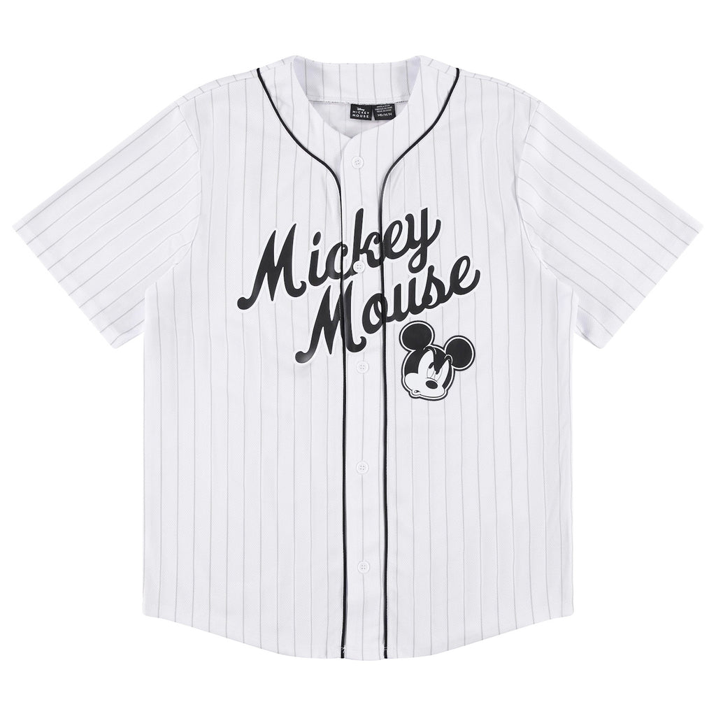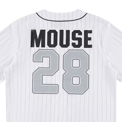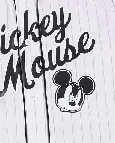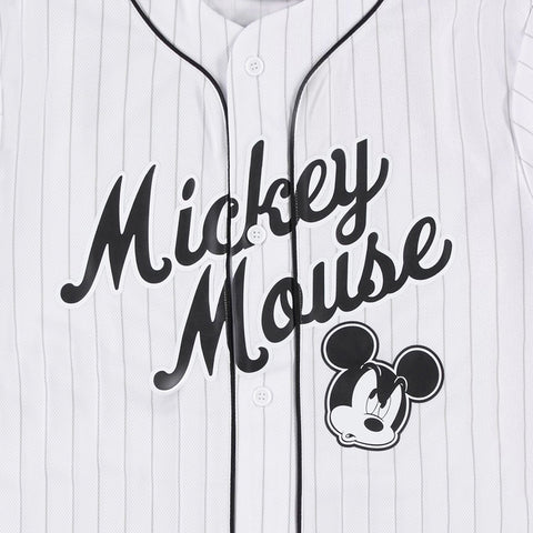 This men's button-up jersey shirt features a black, white, and gray striped design with "Mickey Mouse" printed on the front and "Mouse 28" across the back. Made from 100% polyester, the material provides lightweight comfort, while the short sleeves and full button front support flexible wear. The construction helps maintain the jersey's shape through repeated washing and everyday use. The Mickey Mouse franchise is renowned for its recognizable character styling and long-standing visual elements, and this shirt effectively incorporates those details through clear front and back graphics. The button-up design lends the top a sporty look that works well when layered or worn alone.