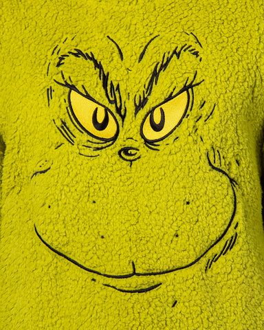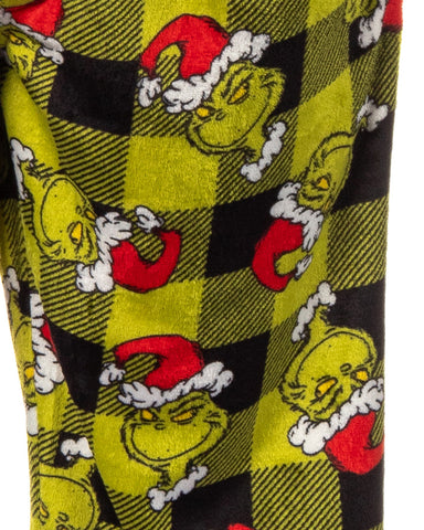 Get ready to steal the show this holiday season with this pajama set. Whether you are a fan of Dr. Seuss' classic character or looking for cozy and festive PJs, this choice is great. This plush fleece set features a green top with an embroidered Grinch face on the front and black and green Santa plaid bottoms. Made with great materials, this sleep set is designed for both comfort and durability. The soft fabric feels gentle against your skin, while the meticulous stitching ensures that your Grinch sleep set will last through many festive seasons. Whether you're lounging around the house, watching holiday movies, or waking up on Christmas morning, our Grinch Sleep Set will keep you in the holiday spirit while keeping you warm and comfortable. It's the great addition to your seasonal wardrobe or a fantastic gift for any Grinch enthusiast.