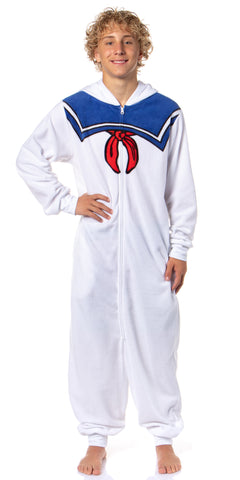 Embrace your love for classic pop funure with this Stay Puft Marshmallow Man Fleece Costume Union Suit! Inspired by the character, it features an embroidered applique of his angry face on the hood, complete with his white sailor cap, red ribbon, and blue hatband. A graphic of his blue sailor's collar accents the neck and shoulders. The double front zipper from neck to crotch makes it easy to wear and remove, while the ribbed cuffs provide a snug fit. Made of soft polyester with a touch of spandex, it’s great for lounging or as a casual costume. Great gift for any Stay Puft fan!