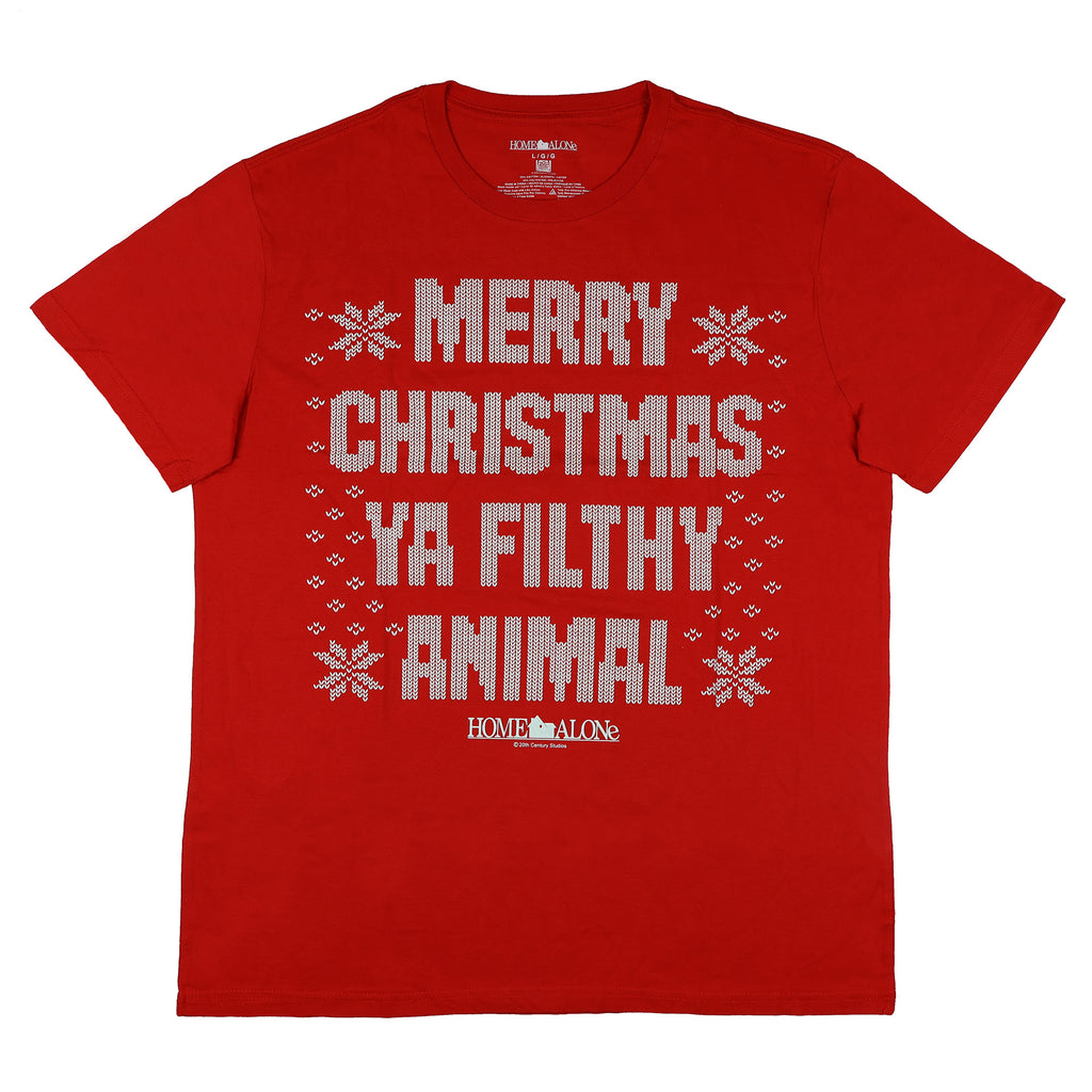 This men's short-sleeve tee highlights one of the most quoted lines from Home Alone. It features "Merry Christmas, Ya Filthy Animal" in sweater-style lettering with snowflake accents. The red base color provides a bold backdrop for the light-toned design, giving it a look that works for lounging, layering, or casual wear. Made with a cotton-polyester blend, the shirt combines softness with durability, making it a dependable option for everyday use. Home Alone has remained a widely loved movie for decades, and its recognizable phrases continue to connect with audiences. This tee blends nostalgic appeal with practical comfort, making it easy to wear around the house, with pajama pants, or out casually.