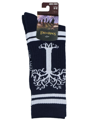 These black crew socks feature the White Tree of Gondor design from The Lord of the Rings, accented with clean stripes and a logo detail on the sole. The design offers a subtle nod to Tolkien's world, providing a simple yet meaningful way to carry a piece of Middle-earth into everyday life. Made with a soft polyester and spandex blend, these mid-calf socks are comfortable, flexible, and maintain their shape well after wearing. They’re easy to pair with sneakers, boots, or casual shoes, whether you’re heading to work, hanging out with friends, or relaxing at home.