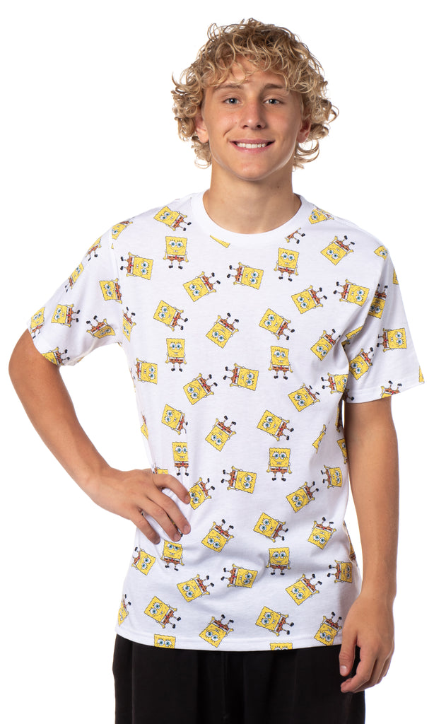 The Nickelodeon Men's SpongeBob All Over Graphic Print Adult Short Sleeve T-Shirt is a vibrant and fun addition to any SpongeBob fan's wardrobe. This t-shirt features an all-over graphic print of the beloved character, SpongeBob SquarePants, smiling with his arms by his sides, creating a lively and playful design. Made from a blend of 60% cotton and 40% polyester, this t-shirt offers a comfortable and durable fit that is great for everyday wear. The printed tag enhances comfort by eliminating any irritation that can come from traditional tags. Whether you're lounging at home or out with friends, this t-shirt is ideal for showcasing your love for the SpongeBob SquarePants in a fun and stylish way.