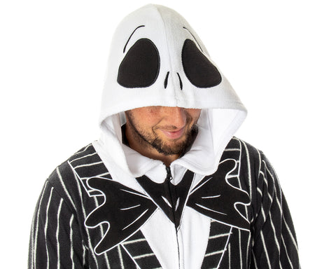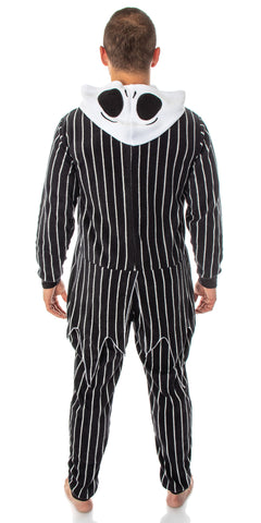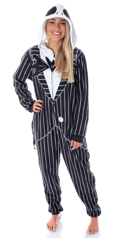 Bring a touch of Halloween Town into your wardrobe with this Nightmare Before Christmas Jack Skellington Costume Pinstripe Suit Pajama One-Piece Union Suit. Designed with embroidered details on the hood and chest, striped fabric, and even tail flaps in the back, it echoes Jack’s classic tuxedo in a cozy, wearable style. Made from 100% polyester, the plush fabric feels soft against the skin, while cuffed sleeves and legs ensure a comfortable fit. A full front zipper allows for easy on and off, and the machine-washable construction makes for simple, everyday care. Perfect for both men and women, this pajama union suit combines playful fandom style with practical loungewear comfort.