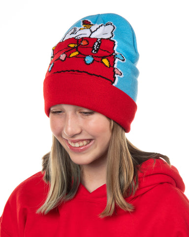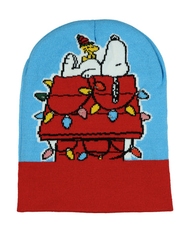 This adult cuff hat showcases Snoopy relaxing on his doghouse with Woodstock resting on his stomach, creating a detailed scene woven into the knit fabric. The doghouse features built-in LED lights that activate with a small button, offering multiple light modes for added visual appeal. Made from 100% polyester, the winter cap provides warmth, stretch, and a comfortable fit while being easy to maintain through spot cleaning. Peanuts has long been recognized for its expressive characters, simple storytelling, and iconic artwork. This knit hat captures that charm by combining Snoopy and Woodstock's classic imagery with practical cold-weather features.