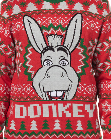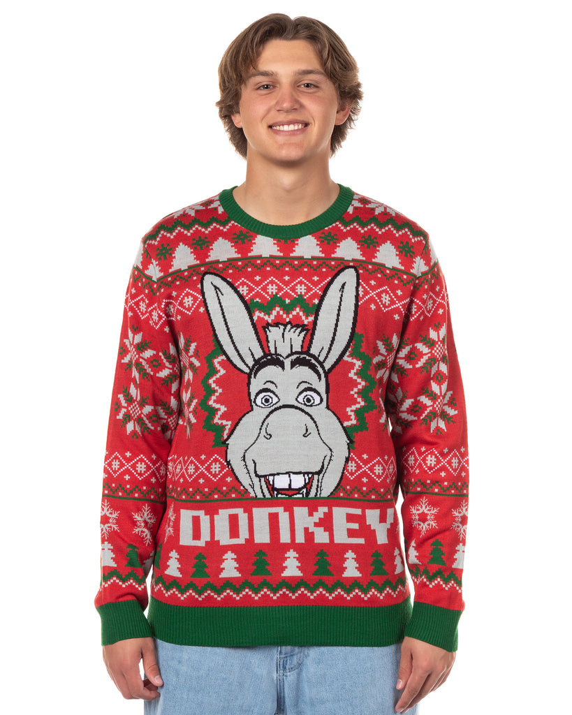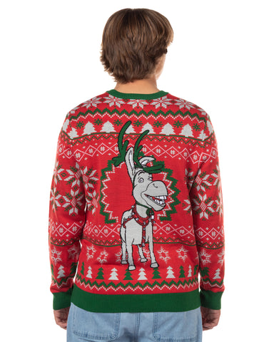 Bring a little swamp-inspired cheer to your wardrobe with this Donkey sweater! Donkey takes center stage on this cozy pullover, his name knitted right below, surrounded by snowflakes and trees in a playful fair isle pattern. Made from soft 100% acrylic, this sweater is comfy, lightweight, and excellent for showing off your love for everyone’s favorite talkative donkey.