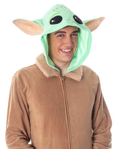 Baby Yoda union suit, guaranteed! The Mandalorian is the new hit series from Star Wars and Disney. Din Djarin is a lone gunfighter and bounty hunter who is sometimes referred to as "Mando," a member of The Mandalorians, a clan of skilled warriors. When one of his bounties leads him to cross paths with a small being only known as the Child. Well, like most of the world, he falls for the little guy whose fans lovingly refer to as "Baby Yoda." This Baby Yoda costume pajama is great for any fan. It has a great costume style look with long 3D ears and a great embroidered face design on the hood. The collar and the sleeve cuffs are made of a super-soft fabric. The costume pajama is made of a flame-resistant 100% polyester fabric, and it has a full zipper closure front.
