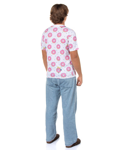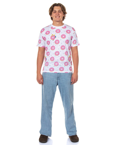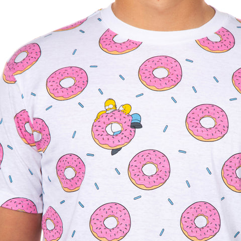 This Simpsons T-shirt features an all-over print of pink doughnuts with blue sprinkles, along with playful illustrations of Homer hugging and biting oversized doughnuts. The white background effectively highlights the graphics, creating a bold and detailed design that spans the whole surface of the tee. Made from a cotton-poly blend, the shirt provides a breathable, soft feel that remains comfortable for everyday wear. The Simpsons franchise remains known for its long-running animated world and memorable characters, and Homer's love for doughnuts is one of the show's most recognizable traits.