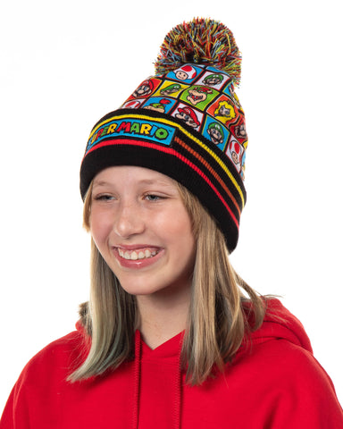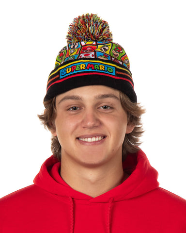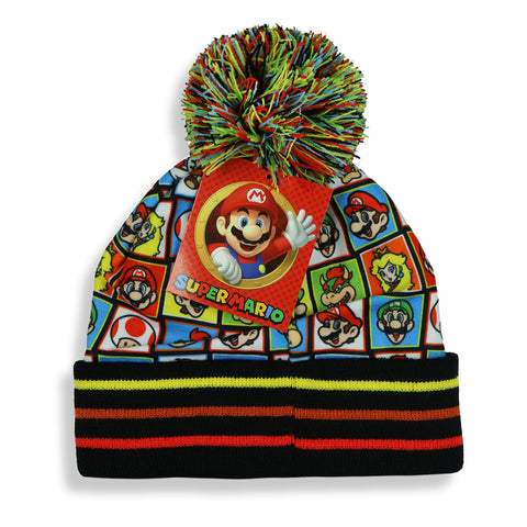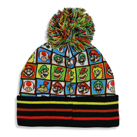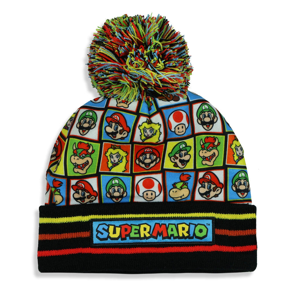 This knit beanie features a colorful grid of Super Mario characters, including Mario, Luigi, Toad, Princess Peach, and others, arranged in small square panels across the hat. The bright pom-pom and striped cuff add contrast and unify the artwork, while the Super Mario patch on the cuff provides a recognizable touch. Made from soft 100% polyester, the cap offers warmth, stretch, and comfort for everyday wear. Super Mario remains one of the most recognizable gaming franchises, known for its bright colors, memorable characters, and adventurous themes. This beanie captures that energy through its design and layout, making it a practical accessory for fans who want to showcase their love for the franchise in their daily wardrobe.