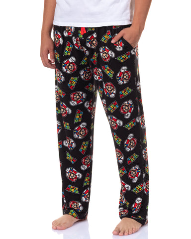These Super Mario men's pajama pants feature a lively all-over design inspired by the classic video game. The pattern features Mario raising his fist as he emerges from a white circle, set against a black background with the words "Super Mario" displayed across it. The pants combine fun design with practical construction, including a drawstring waistband, button fly, and side pockets. The polyester-spandex blend provides a soft feel and a gentle stretch that maintains comfort and durability throughout everyday wear. Super Mario remains one of the most recognizable gaming franchises in the world, known for its bright colors and adventurous characters. These pajama bottoms capture that playful energy in a comfortable, functional style that's made for lounging or relaxing.