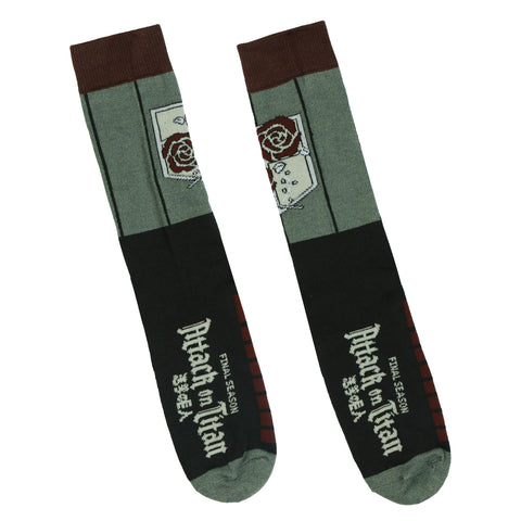 Step into the world of Attack on Titan with this two-pack of crew socks. Each sock, featuring two distinct designs—the Garrison Regiment sock in grey and maroon and the Scout Regiment in cream and green—showcases graphics designed for fans who appreciate attention to detail.