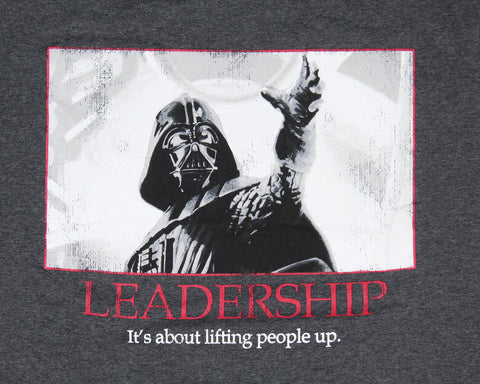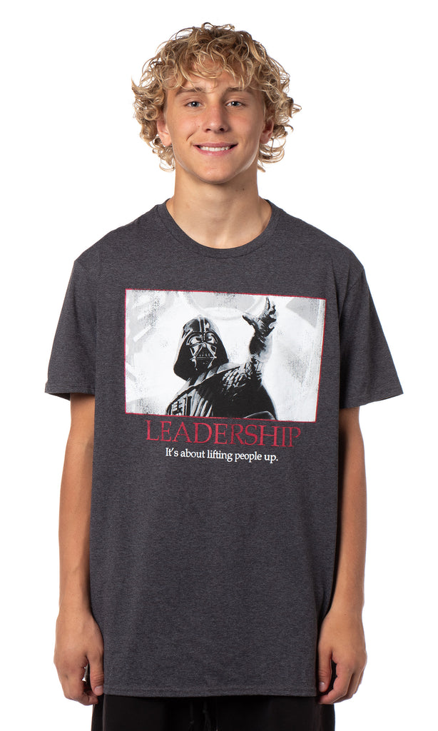 The Star Wars Men's "It's All About Lifting People Up" Adult Short Sleeve T-Shirt is a fun and clever nod to the legendary Darth Vader. The shirt's centerpiece is a square graphic with a white background, featuring Darth Vader with his hand raised as if using the Force. This pose, familiar to Star Wars fans, captures Vader's formidable presence and power. Underneath the square, the word "Leadership" is prominently printed, adding a satirical twist to the design. Below that, in smaller text, the phrase Its about lifting people up playfully reinterprets Vaders often ominous actions. Crafted from soft, breathable fabric, this T-shirt is designed for comfort and casual style. The classic short sleeve and crew neck design makes it easy to wear for various occasions, whether at a Star Wars movie marathon, a convention or just enjoying a casual day out.