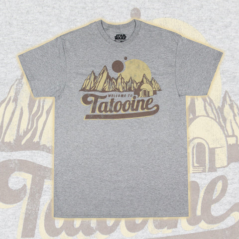The Star Wars Men's "Welcome to Tatooine" Distressed Adult Short Sleeve T-Shirt captures the essence of one of the most locations in the Star Wars universe. The shirt features a beautifully distressed illustration of Tatooine's arid landscape, with the planet's famous twin suns casting their warm glow over the desert. Luke Skywalker's modest hut is depicted in the foreground, grounding the design in the rich lore of the Star Wars saga. The words "Welcome to Tatooine" are boldly printed in a weathered, vintage font, enhancing the retro vibe of the shirt. Crafted from a soft and breathable cotton blend, this T-shirt ensures comfort and durability, making it great for daily wear or special Star Wars-themed events. Its classic fit and neutral color palette makes it a versatile piece, easily paired with various outfits for a relaxed, yet stylish, look. Whether you're a long-time fan or new to the saga, this T-shirt offers a timeless tribute to the legendary world of Tatooine.