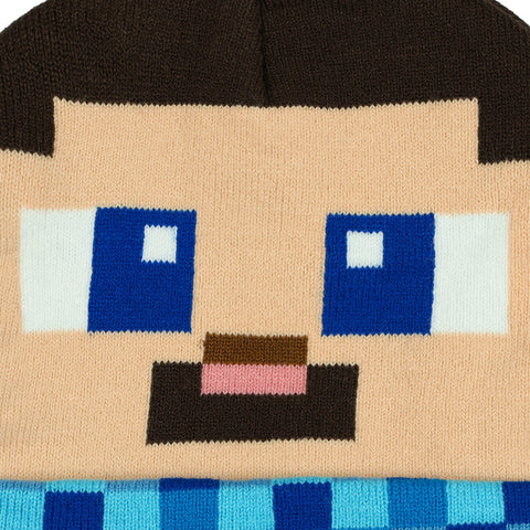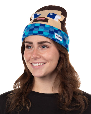 Level up your cold-weather style with this Minecraft Diamond Steve Big Face Cuff Beanie. Made from 100% soft acrylic, this cozy knit hat captures the bold, blocky look of the game's iconic character design. The crown features a large pixelated Steve face, while the folded cuff displays a shimmering blue pixel pattern inspired by in-game diamond textures. The combination of colors and patterns creates a fun, eye-catching look that gamers will instantly recognize.