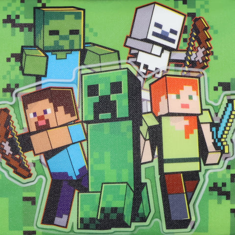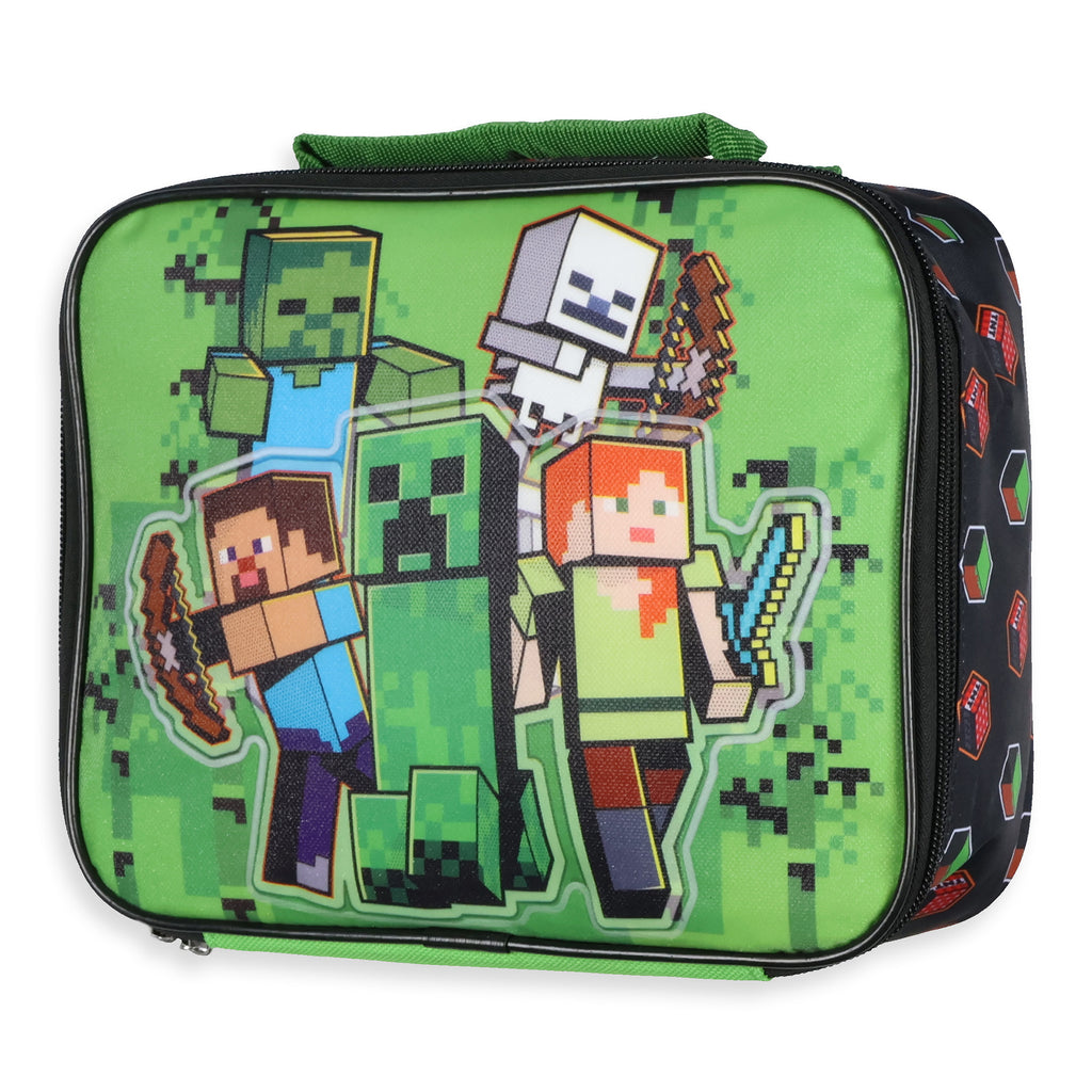 Fuel up for the next big adventure with this Minecraft lunch box featuring fan-favorite characters like Zombie, Skeleton, Alex, Creeper, and Steve. The front design has a shimmering sheen that catches the light, giving it an eye-catching look that any young gamer will love. Built for everyday use, the full zip-around closure makes it easy to access meals, while the insulated interior keeps food fresh until it’s time to eat. This lunch box is designed for comfort and convenience, has a padded top handle for easy carrying, and a durable structure for daily use. The spacious interior is great for packing a well-balanced meal, and its wipeable lining makes cleanup a breeze. Whether heading to school, a picnic, or a gaming marathon with friends, this Minecraft lunch box is a must-have for fans who want to bring their favorite world into the real one, not intended for children under the age of 3.