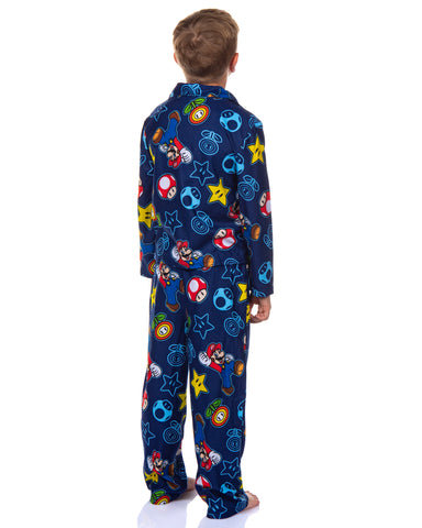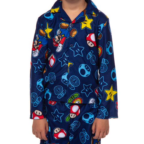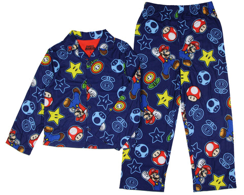 Looking for the great pajama set for the young fan in your life? This Nintendo Super Mario Kid's All-Over Print 2-Piece Long Sleeve Pajama Set is great pajama set for fans of the symbolic video game series. This set includes a long sleeve, button-down, collared coat-style top paired with elastic waistband pajama pants for a comfortable fit. Made from flame-resistant 100% polyester, these pajamas feature a colorful all-over print of Mario and classic power-up s from the beloved Super Mario video game franchise. The cozy long-sleeve top and full-length pants make it ideal for keeping warm on chilly nights, while also serving as stylish casual loungewear. This pajama set makes a wonderful gift for Christmas, birthdays, or any special occasion.