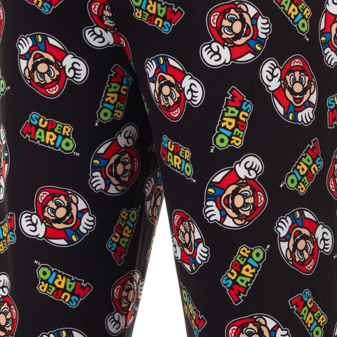These Super Mario men's pajama pants feature a lively all-over design inspired by the classic video game. The pattern features Mario raising his fist as he emerges from a white circle, set against a black background with the words "Super Mario" displayed across it. The pants combine fun design with practical construction, including a drawstring waistband, button fly, and side pockets. The polyester-spandex blend provides a soft feel and a gentle stretch that maintains comfort and durability throughout everyday wear. Super Mario remains one of the most recognizable gaming franchises in the world, known for its bright colors and adventurous characters. These pajama bottoms capture that playful energy in a comfortable, functional style that's made for lounging or relaxing.