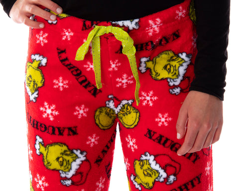 These are GREAT Dr. Seuss Grinch Pajama Pants. Dr. Seuss wrote GRINCH Who Stole Christmas, which is an all-time great holiday Christmas story that men, women, boys, and girls all know and love! These Dr. Seuss Grinch Fleece Plush Pajama Pants features an allover design of GRINCH with a Santa hat and the saying "Naughty." It is a super soft fleece fabric with a Minky touch feel. Made of 100% polyester.
