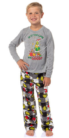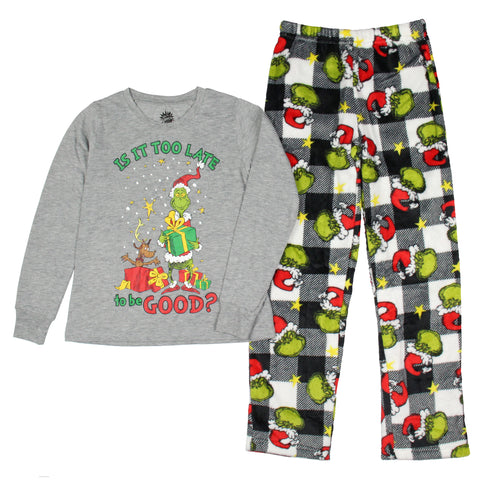 Stay festive this Christmas with matching family pajama sets featuring The Grinch from Dr. Seuss's "The Grinch Who Stole Christmas." The men's set includes a black long-sleeve t-shirt with a smiling Grinch and the text "It Wouldn't Be Grinchmas Without Me!". The women's set features a red long-sleeve t-shirt with the Grinch and the text "Feelin' Grinchy". The kids' set has a grey long-sleeve t-shirt with the Grinch, Max, and the text "Is It Too Late To Be Good?" The toddler set includes a red long-sleeve t-shirt with the Grinch and "Dear Santa, I Can Explain." The infant set is a fleece sleeper with a matching beanie. All sets come with fleece pajama pants crafted from 100% polyester for comfort and durability! you will love them!